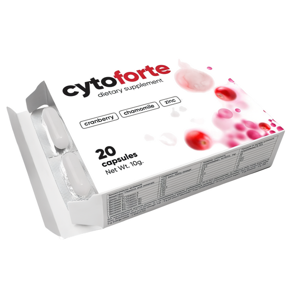 CytoForte est une formulation soigneusement élaborée pour soutenir la santé des voies urinaires, en particulier pour les personnes souffrant de cystite chronique. Ce produit contient un mélange d'ingrédients naturels tels que l'extrait de cranberry, des acides organiques, des triterpènes, des flavonoïdes, des pectines et de l'acide benzoïque. Ces composants sont reconnus pour leur capacité à favoriser un environnement équilibré au sein du système urinaire, contribuant ainsi au bien-être général.